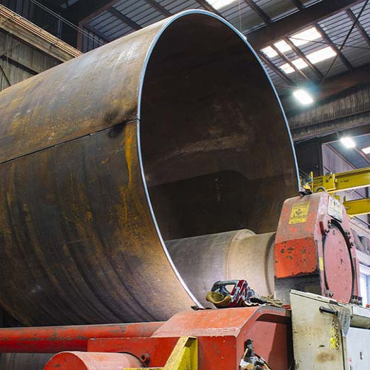 Rolling of steel plates into cylinders, cones and curved shapes for industrial fabrication and structural applications.
